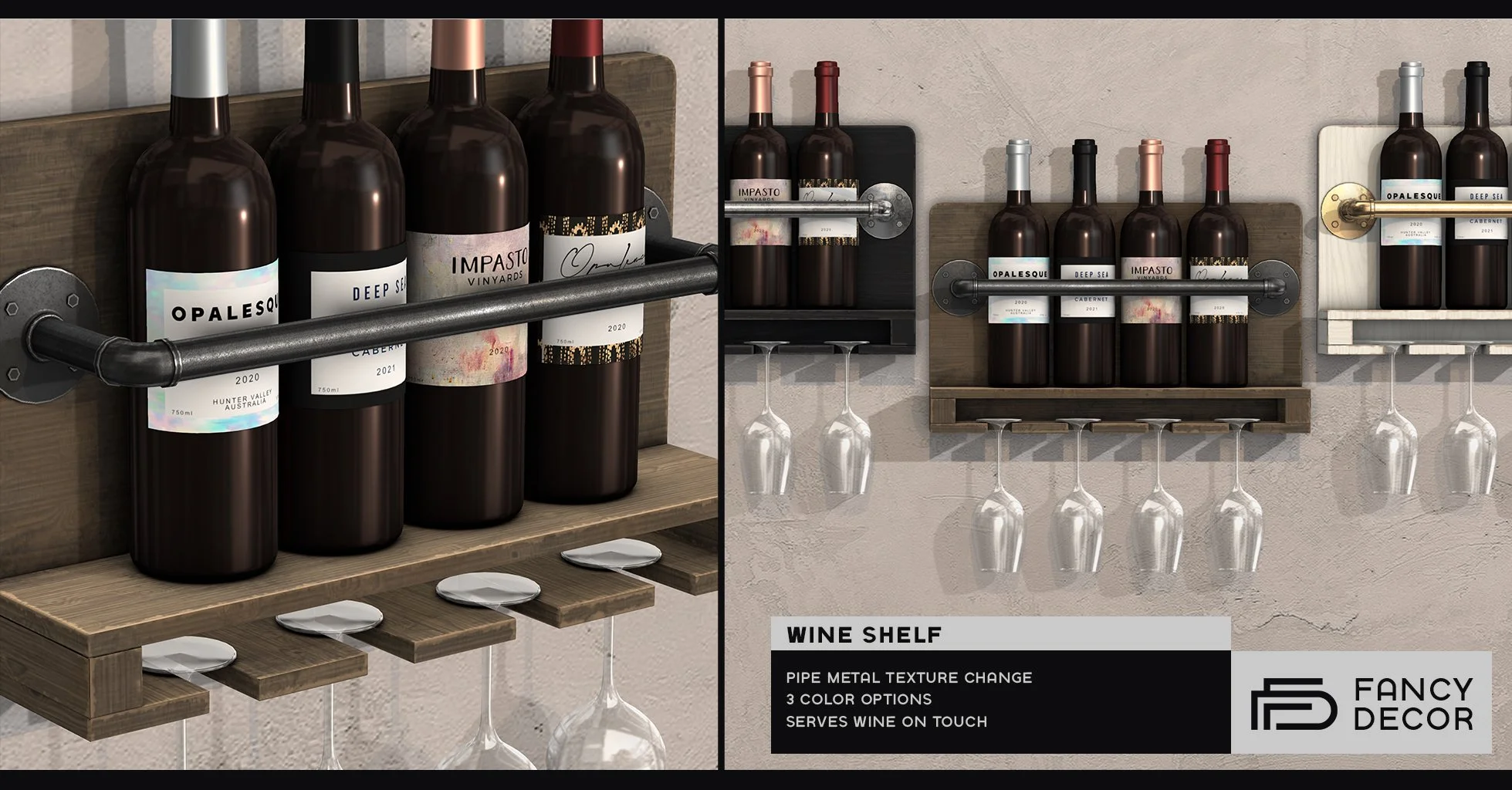 Jake Vordun May 9, 2022 Wine Shelf @ Alpha Event Jake Vordun May 9, 2022 Available in 3 wood finishes, each comes with a metal texture change HUD, and serves wine on touch! Visit Alpha Event